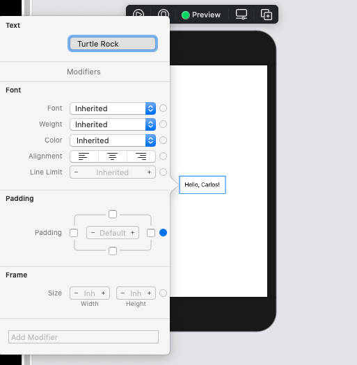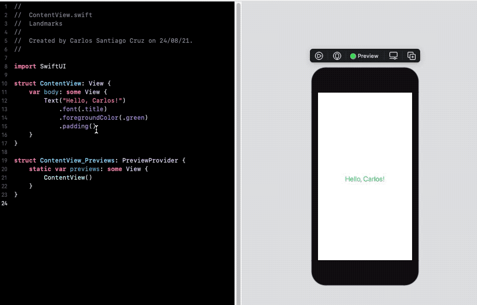 padding()modifier to theforegroundColor(.green)modifier, this changes the text's color to green.