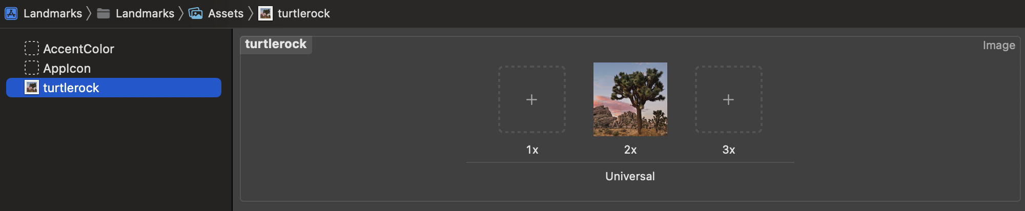 Find turtlerock@2x.jpg in the project files’ Resources folder; drag it into the asset catalog’s editor. Xcode creates a new image set for the image.