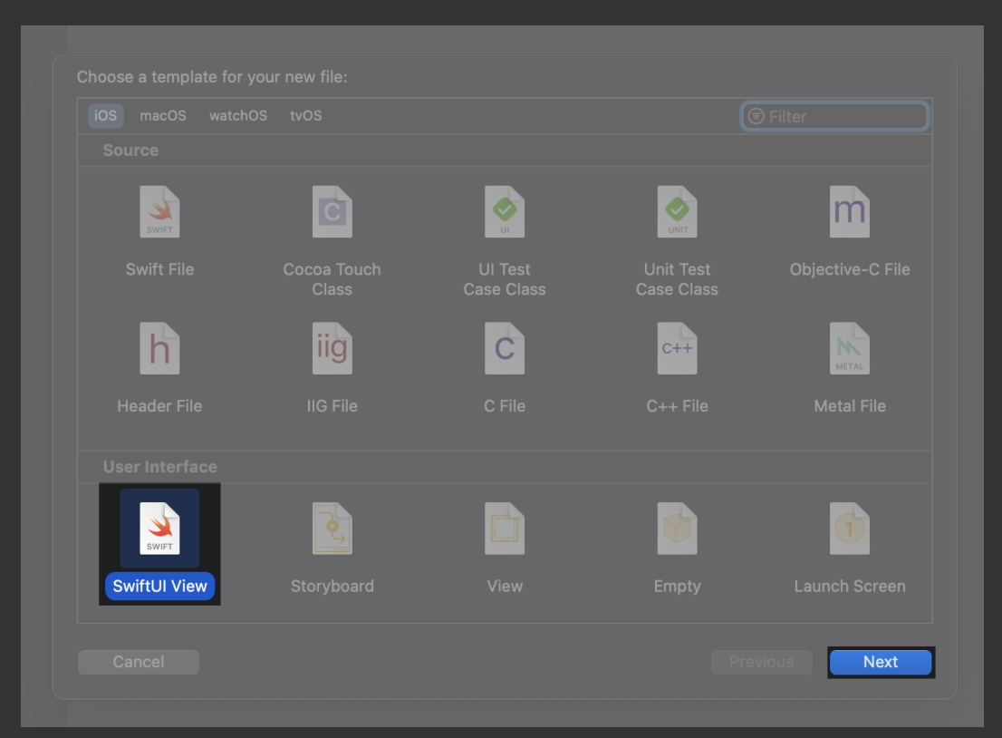 Choose File > New > File, select iOS as the platform, select the “SwiftUI View” template, and click Next. Name the new file MapView.swift and click Create.