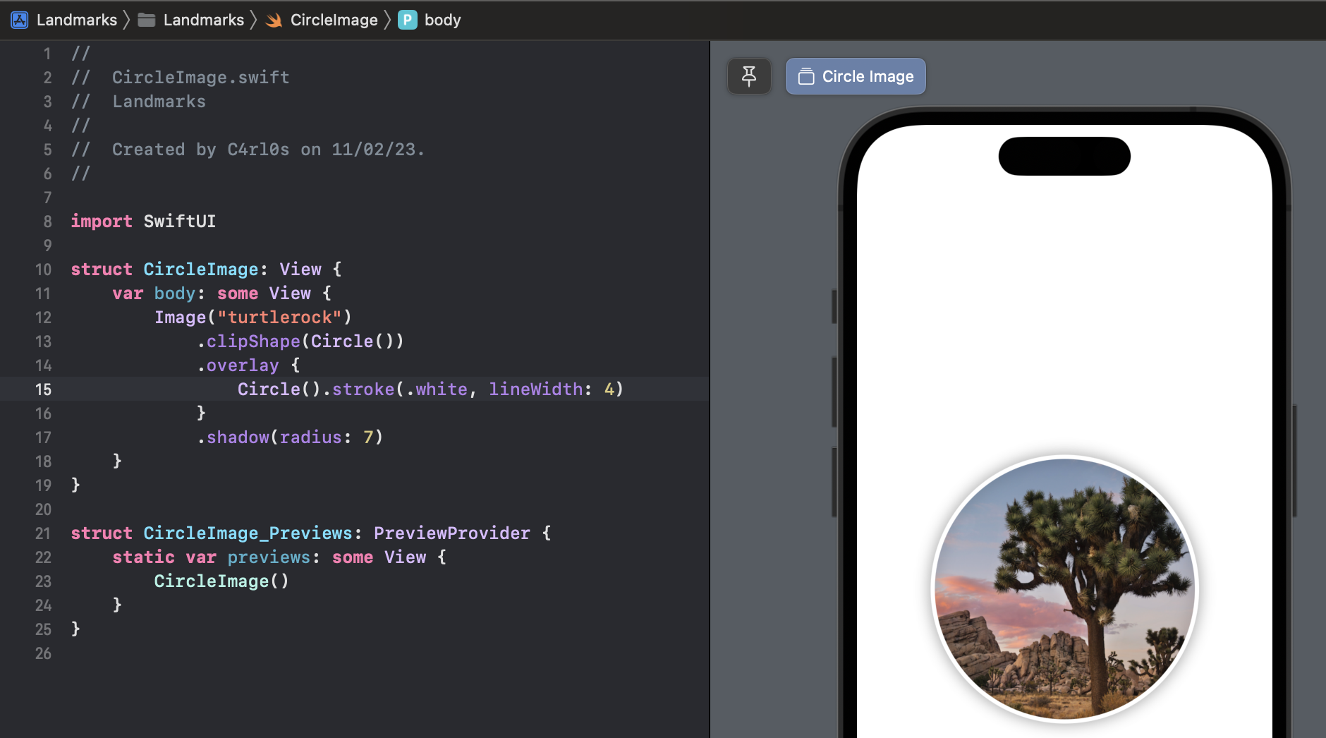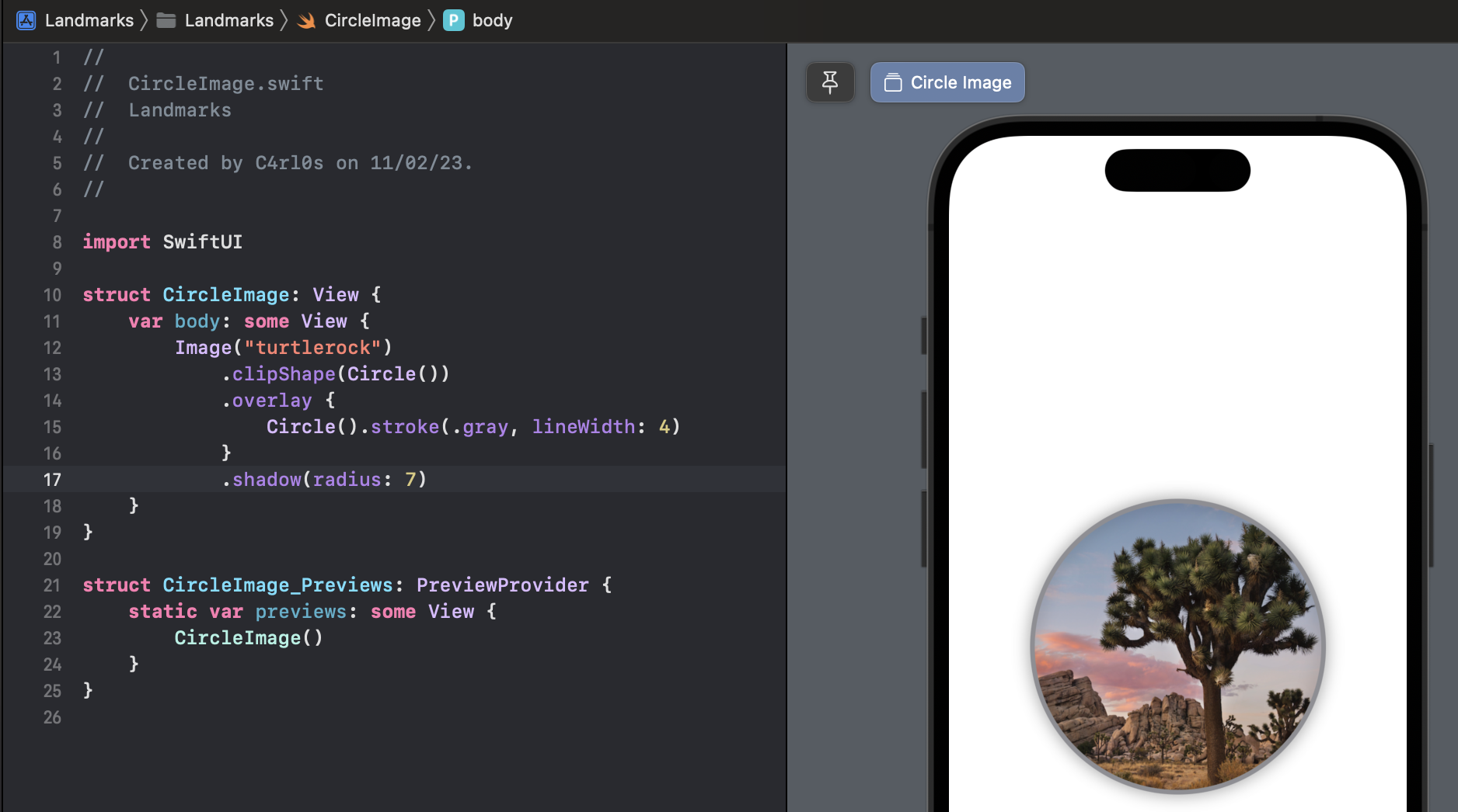 Instead of adding more code in this file, you’ll create a custom view that applies a mask, border, and drop shadow to the image.