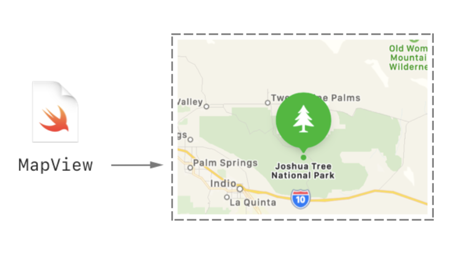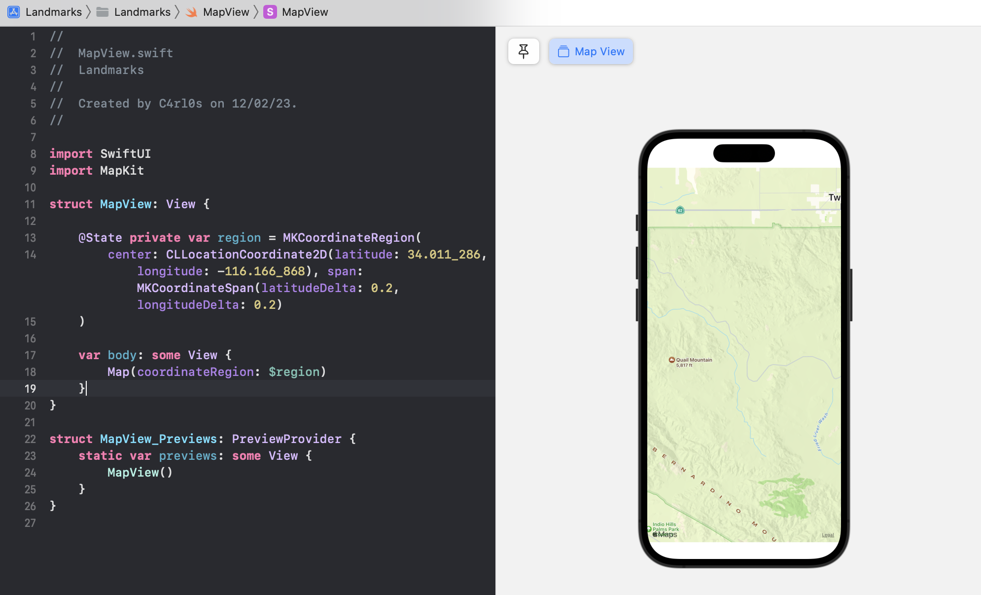 }Next you’ll create a map that centers on a given coordinate. You can use the Map view from MapKit to render the map.