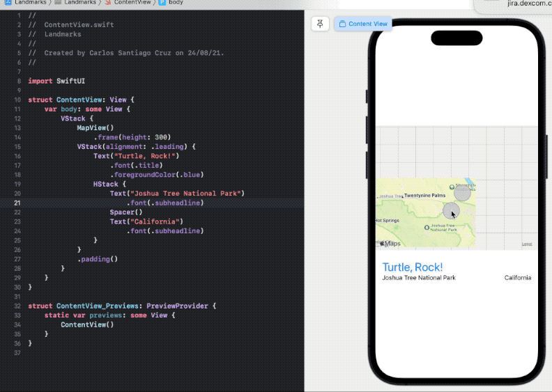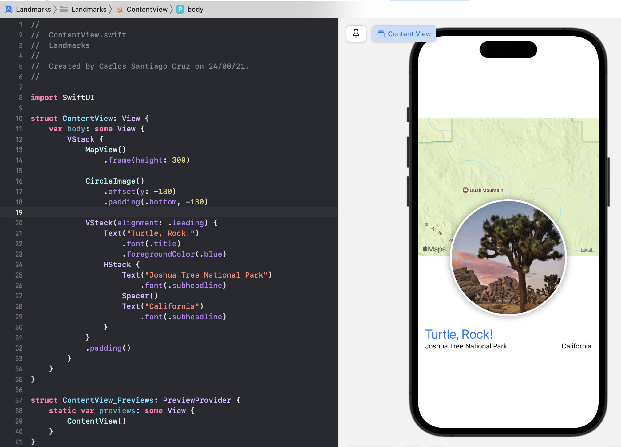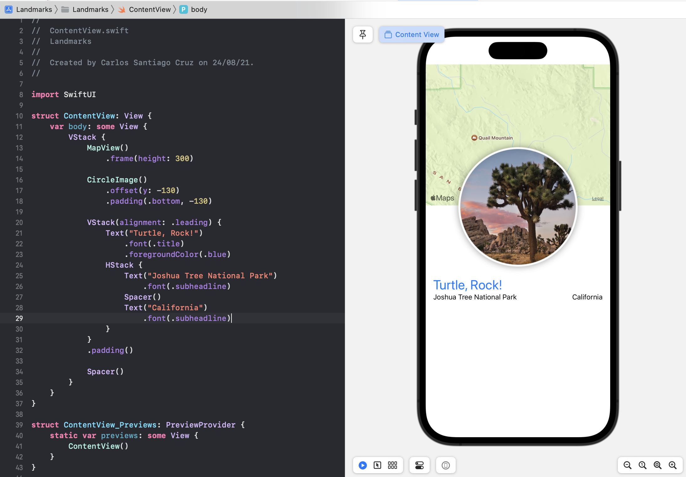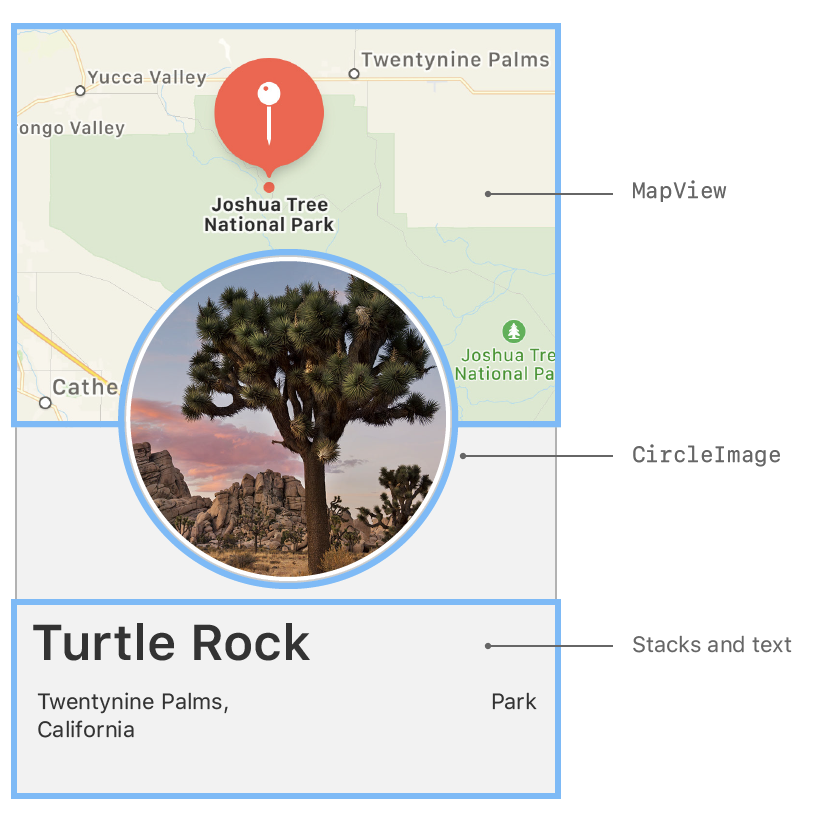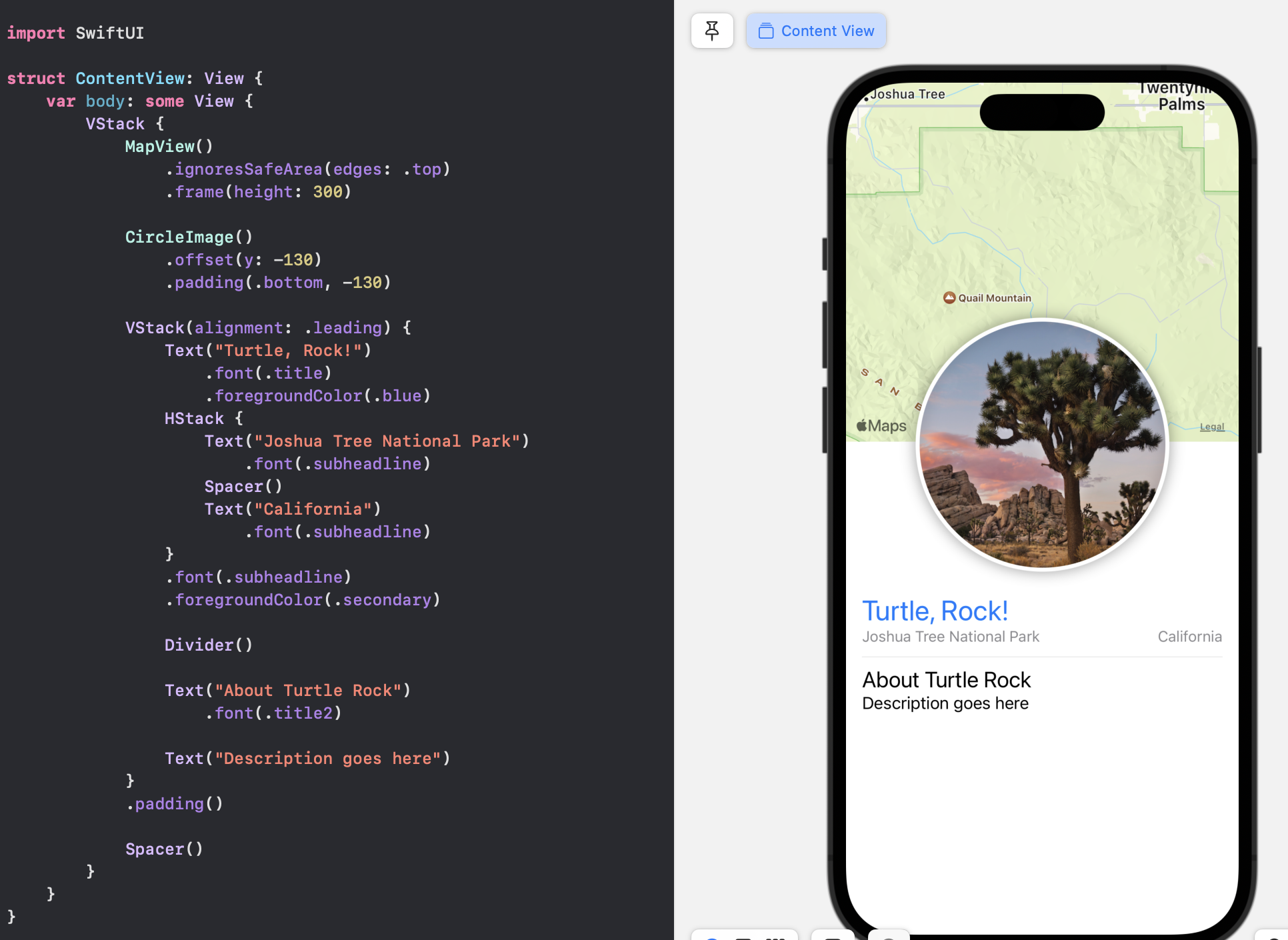 To lay out the views, Landmarks uses stacks to combine and layer the image and text view components. To add a map to the view, you will include a standard MapKit component. As you refine the view's design, Xcode provides real-time feedback so you can see how those changes translate into code.