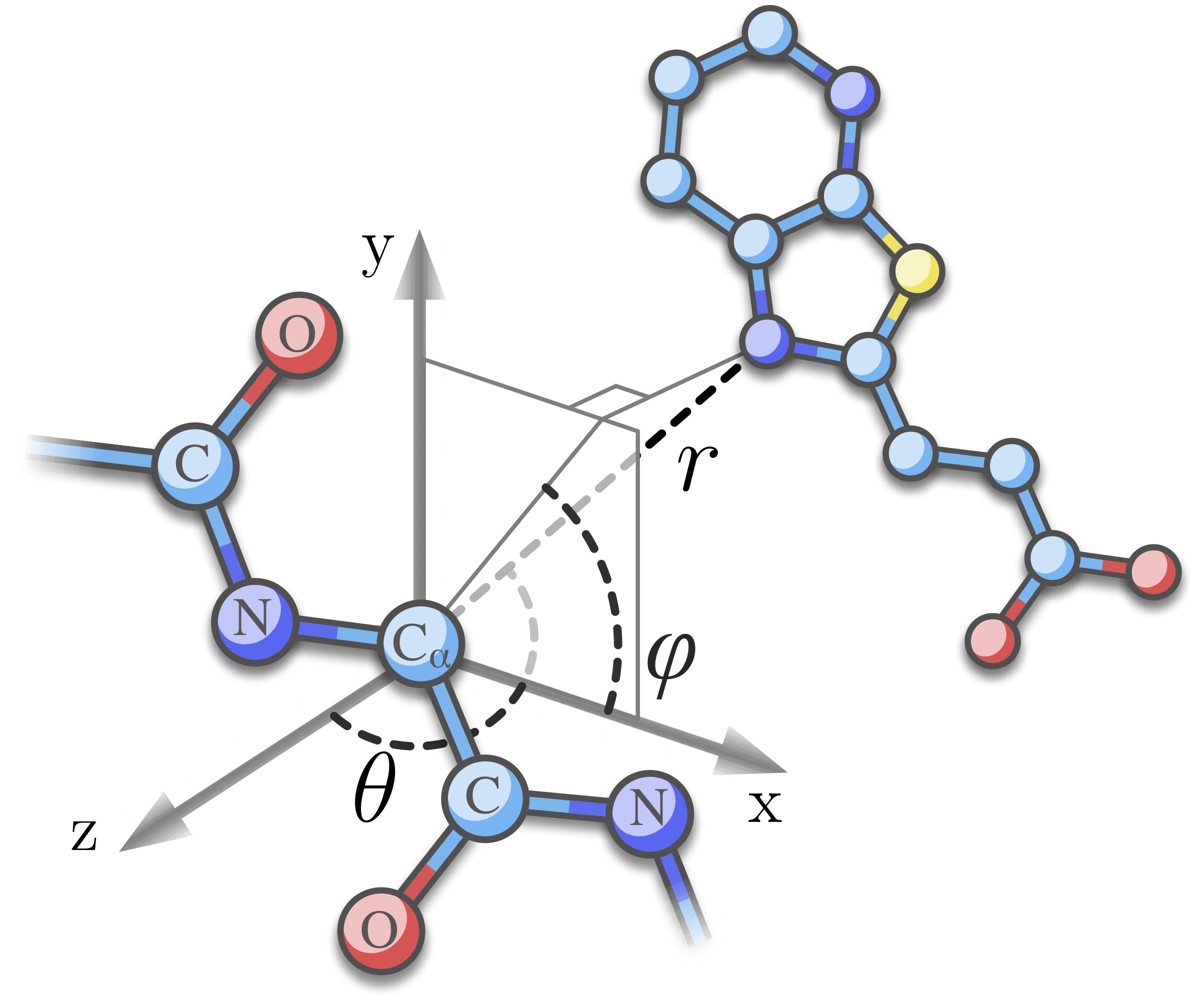 Schematic view of the relative orientation of a ligand molecule to a protein residue. The residue is represented with a 3D oriented frame built from three backbone atoms. The relative orientation of a ligand atom is described by two spherical angles, θ, the polar angle between the r and z vectors, and φ, the azimuthal angle between x and the projection of r into the xy plane. |