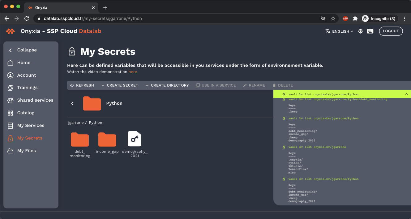 - When the user log into it's container (e.g: RStudio, Jupyter), the environnement is pre configured according to he's profile, the user don't have to fill in it's credentials. For example he can easily access the file he previously uploaded from the GUI using the pre-configured minio client. He can also push to GitHub without having to to type he's password.