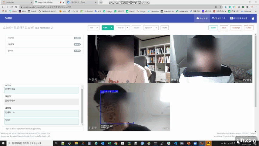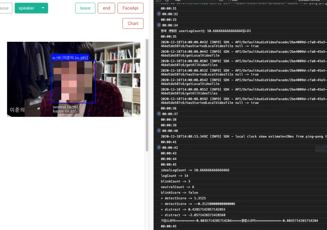 화상채팅과 통합시켜 초당 2회 얼굴 감정, 눈 깜빡임, 자동 출석을 위한 인물 인식을 수행했습니다. 그리고 10초에 한 번씩 얼굴 데이터들로 집중 점수 +,- 를 결정합니다.