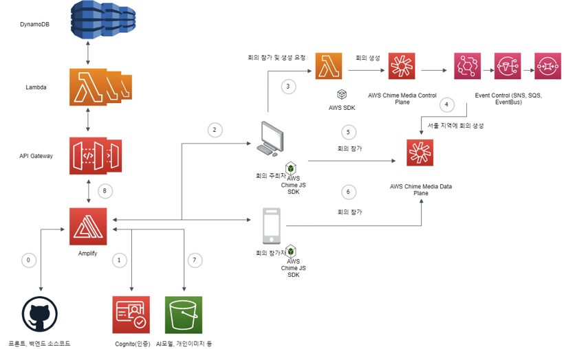 | 백엔드 | AWS Chime SDK, AWS API Gateway, AWS Lambda, AWS DynamoDB, AWS Amplify, Node.js, Express, AWS SDK |