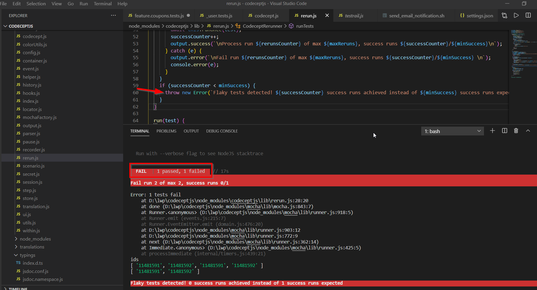 My codecept tests are very stable and many failed ones will be failing again in rerun. In that case codeceptJS is throwing an error (see line of code below) and my testrail-import addon won't get triggered.
