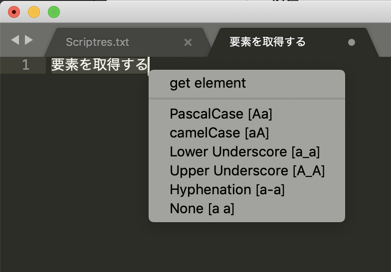 良いプラグインを有難うございます。 上記環境で、日本語文字列を選択してコマンド+Shift+Dを押下すると、 <img width="392" alt="sublime textscreensnapz001" src="https://user-images.githubusercontent.com/3312530/48928501-f3064100-ef22-11e8-8f78-74c78b9a0299.png"> の様になり、どのレターケースを選択しても`get element`にしか変換できません。