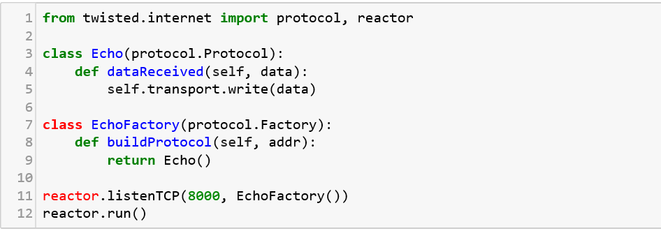 Twisted is an open source, event-driven networking engine that supports many common transport and application layer protocols, including TCP, UDP, SSL/TLS, HTTP, IMAP, SSH, IRC, and FTP. It comes with client and server implementations for all of its protocols which makes it easier to deploy and configure. Let us see a sample implementation of twisted that echoes every user input when connected using a telnet.