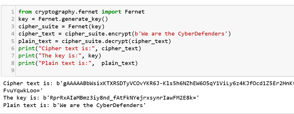 This package includes both high level and low level interfaces to common cryptographic algorithms such as symmetric ciphers, message digests, and key derivation functions. Here, a Fernet is an implementation of symmetric (also known as “secret key”) authenticated cryptography which guarantees that a message encrypted using it cannot be manipulated or read without the key. Let us try to encrypt and decrypt a message using this package function: