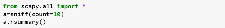 This will sniff the network for 10 packets and once they have been sniffed, it will print their summary.
