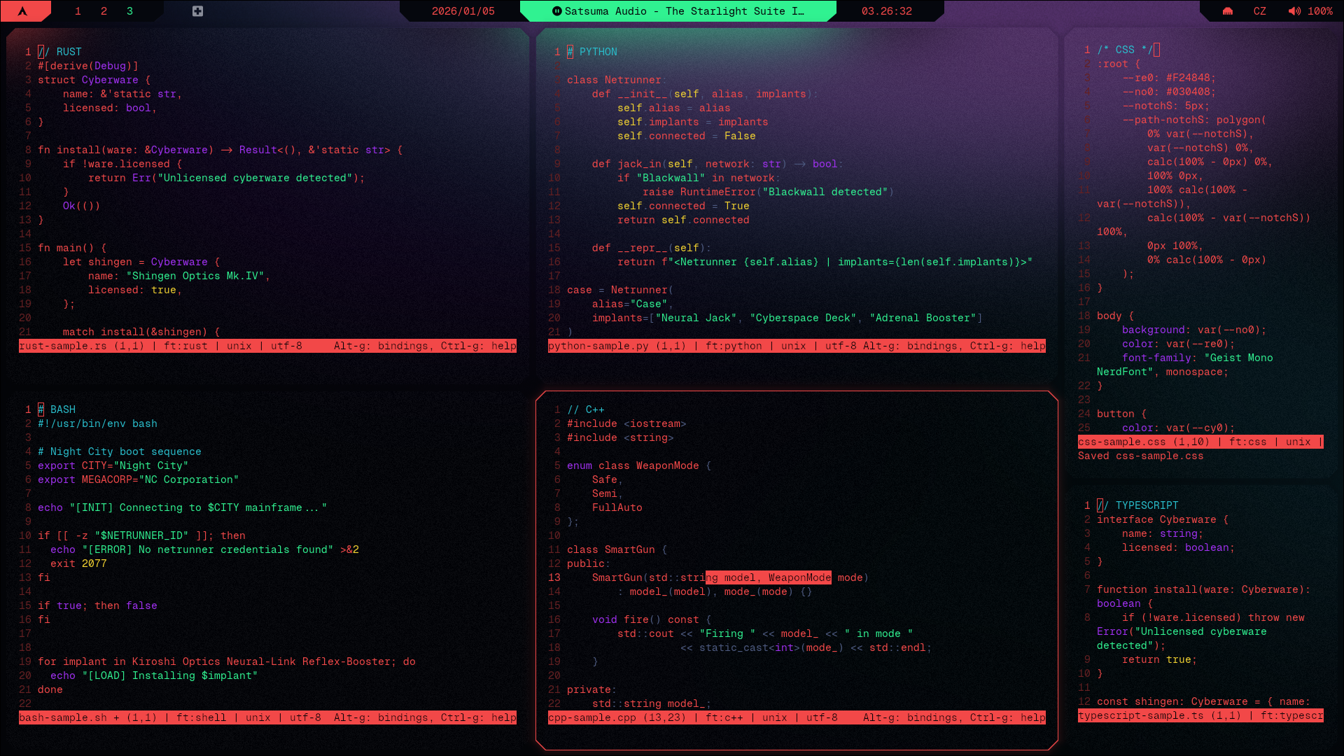 micro ↗ (top-left to bottom-right: rust, python, css; bash, c++, html)