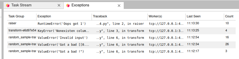 Or is your goal to capture a history of exceptions? Typically the Dask dashboard doesn't try to capture much history. It's more about getting a view of current state. Thoughts?