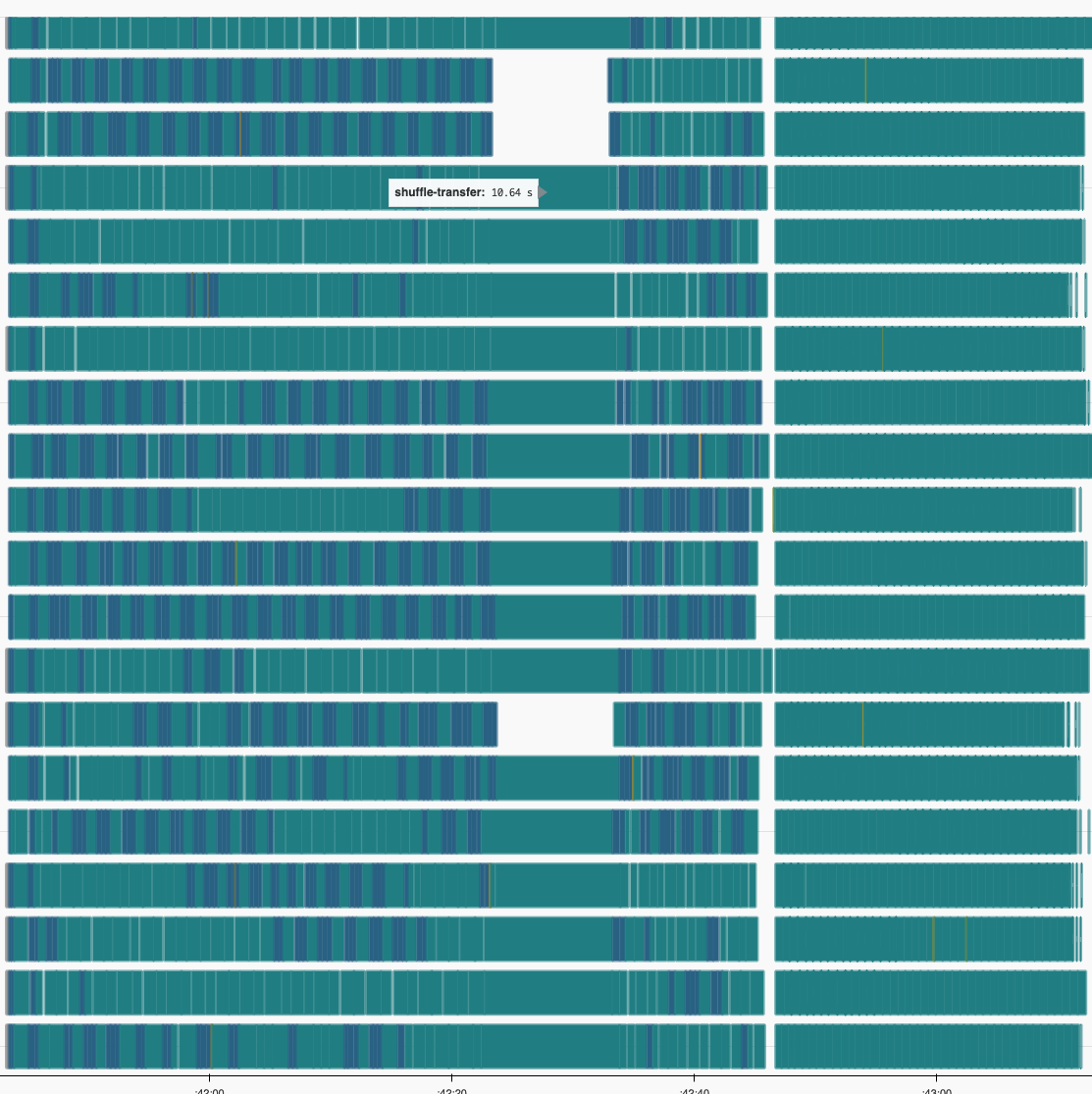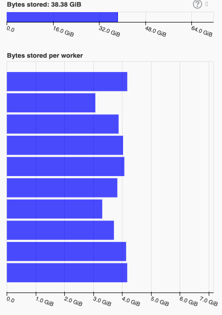 I ran this on an actual cluster once and adjusted the buffer size a bit. I think we'll need to iterate on this a little more. This specific run was using 8GiB workers and I set the limit to half of that. Once the buffer reaches this size, we can see that the computation freezes up. Some still running transfers take up ~10s (ordinarily 500ms) and new ones are not even scheduled. This is very likely due to a blocked event loop when writing 4GiB at once. It also looks like we got some leftover data in memory after the shuffle completed |