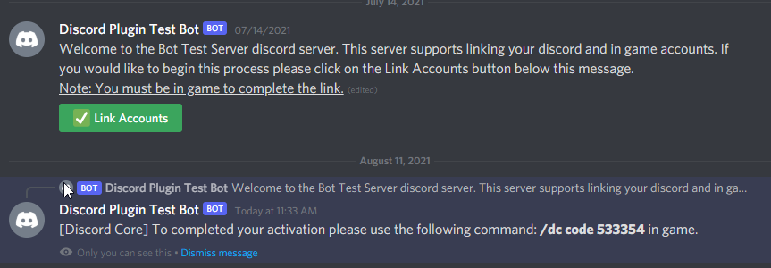 }Guild link message will place a message in a guild discord channel with a button users can use to start the linking process. The players will be sent a message in the same channel that only they can see and isn't displayed to any other users.