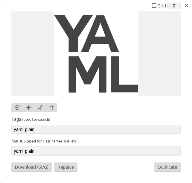 Hello, This PR has been merged. However I don't find the YAML icon in the repo. I looked in the svg folder and in the css file. |