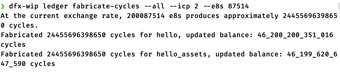 dfx ledger fabricate-cyclescan now accept amounts in ICP or e8s, making it a drop-in replacement fordfx ledger top-up. It fetches the current exchange rate from the real IC.Description