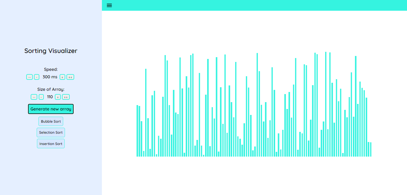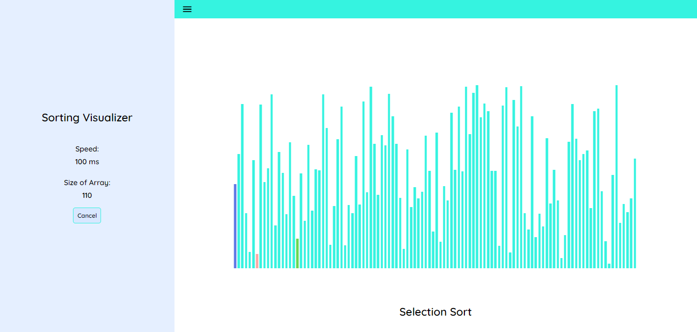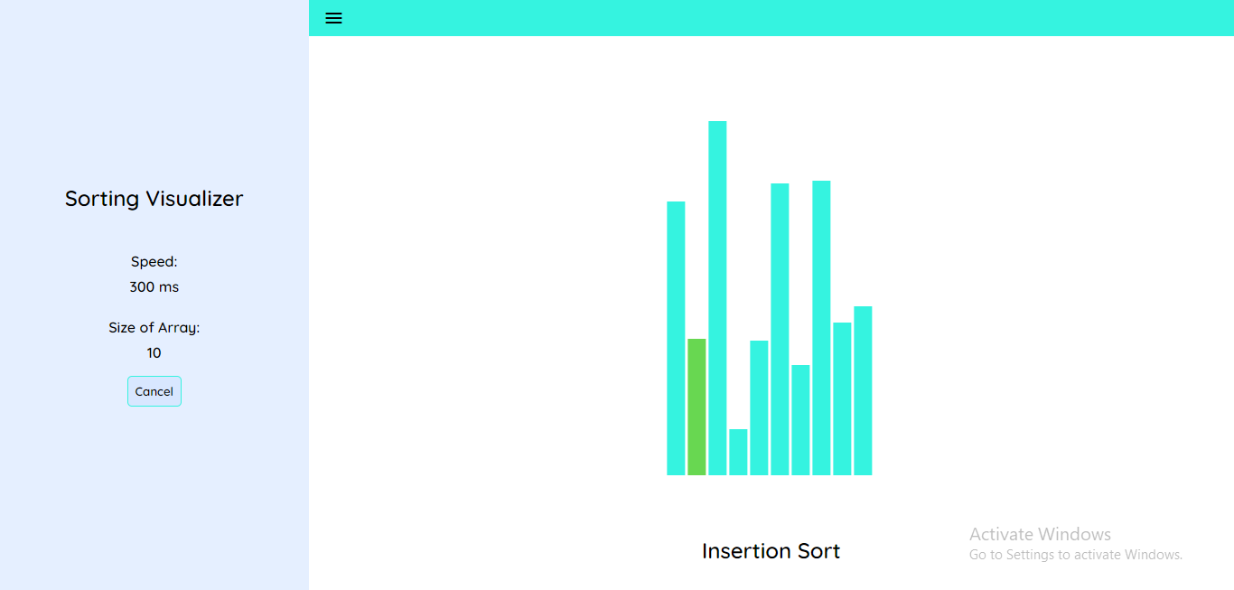 > npm startIt is an algorithm visualiser application. You can see how Bubble sort, insertion sort and selection sort work. You can configure the size of array and the time interval/speed of the animation. More algorithms will be added soon!