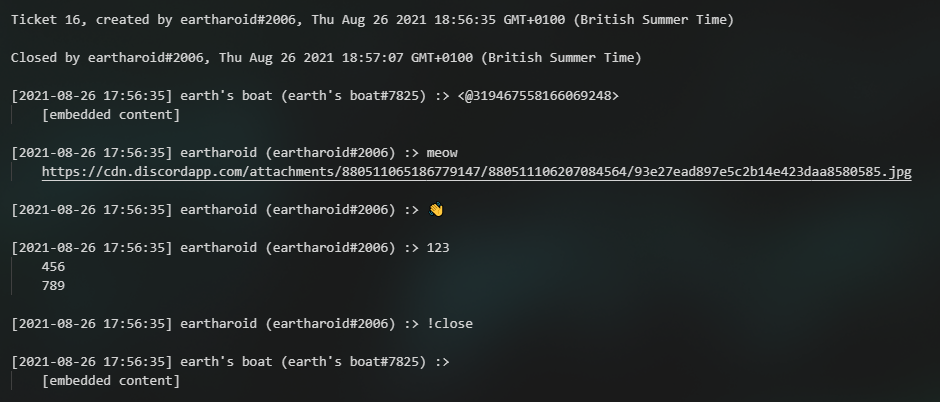If log_messages is enabled, this plugin sends a text file to the ticket creator (and to a log channel if configured) when a ticket is closed.