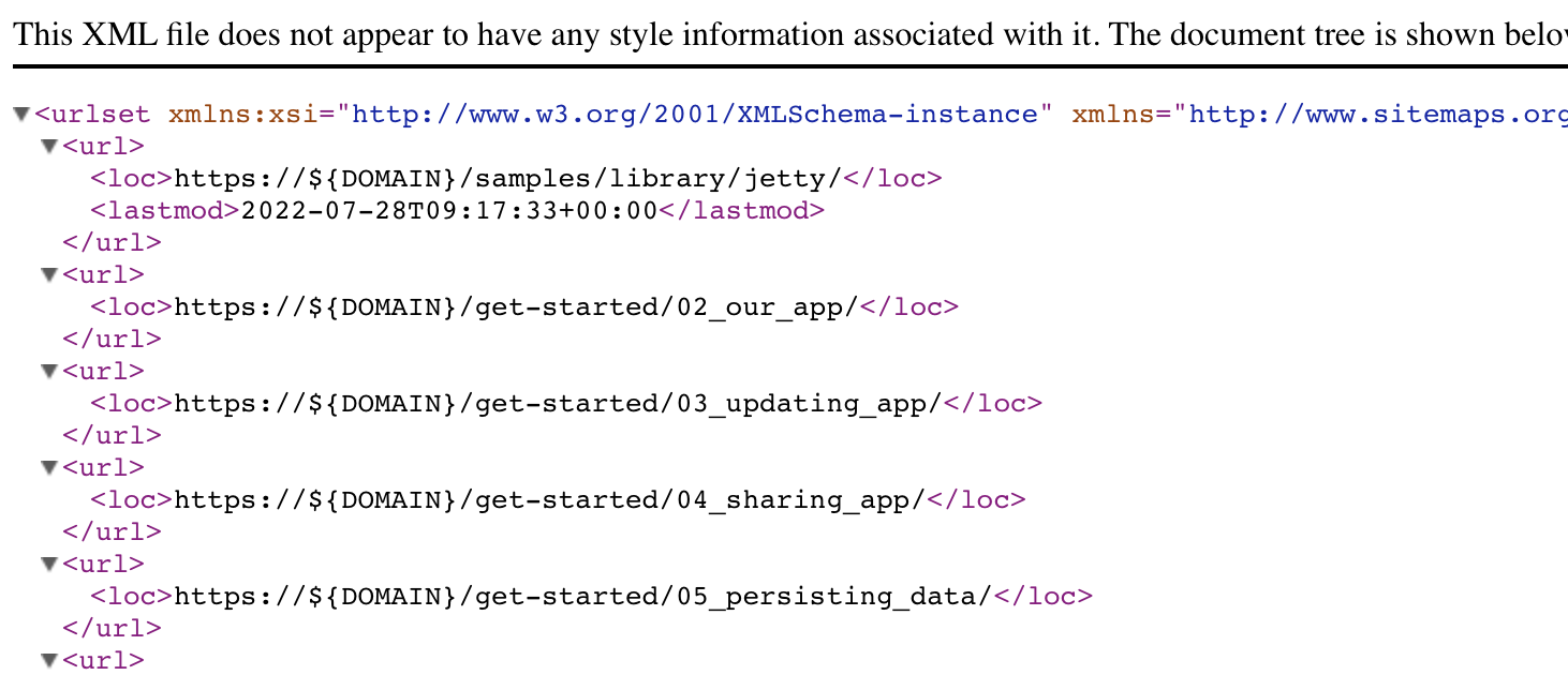 Hmm... looks like something is broken in general on docs.docker.com; https://docs.docker.com/sitemap.xml looks like the env-var is not being substituted; did we break that somewhere along the line? Funny thing is that the first entry actually looks to have a date set, but items following it don't? |