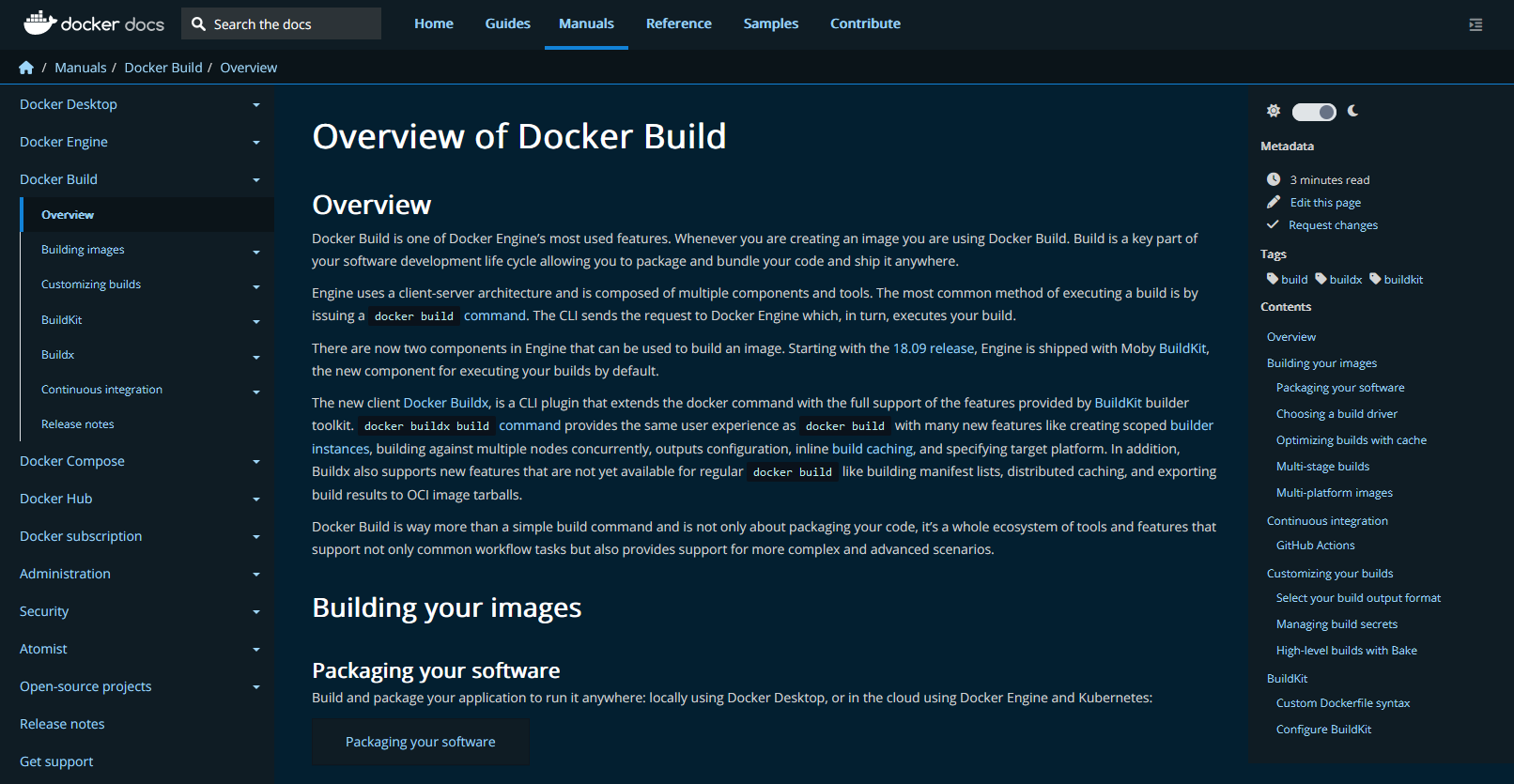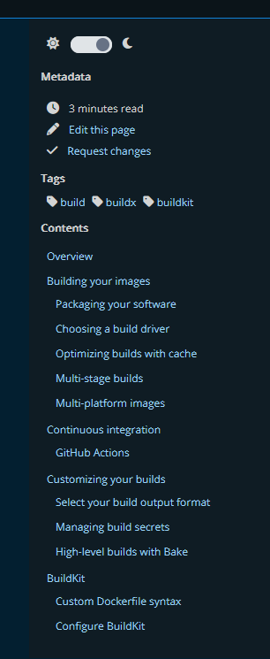 needs #15993needs #15998Move tags and reading time from content body to the toc nav as it seems more appropriate to have it there. I also took the opportunity to move the edit page and request changes links to the metadata block instead of having it under "Contents" as it's not visible at first sight on some pages like https://docs.docker.com/engine/reference/builder/.