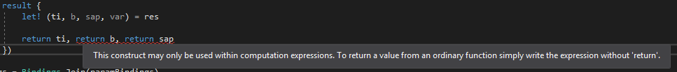 FS0748: This construct may only be used within computation expressions. To return a value from an ordinaty function simply write the expression without 'return'.