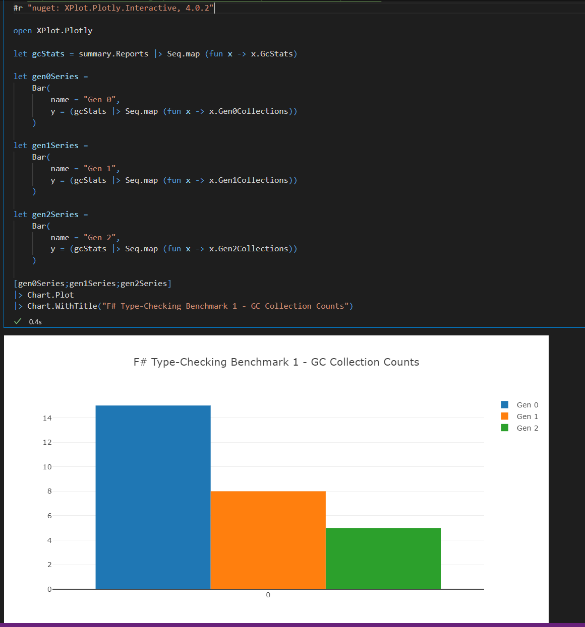 This does some cleanup to FSharp.Compiler.Benchmarks and adds a basic .NET Interactive notebook that will run a F# benchmark and display the GC collection counts in a graph. This is the first of many benchmarks we will make.