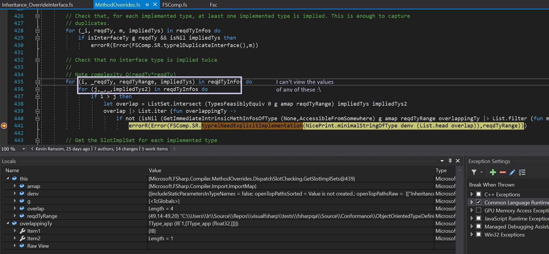 s |> List.iter (fun i -> ...)versusfor i in s do ...have equal semantics, but vastly different debuggability.In the first case, you can only see the loop-local variables in the debugger (