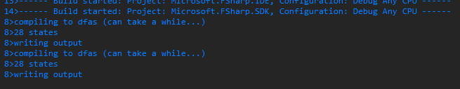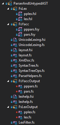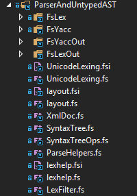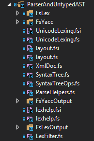 *.fsl/fsyinput/output closer together, but the FsYacc and FsLex build tasks prevent this from happening. I.e., try movingUnicodeLexing.fsiup: you can't. I think this is the next best thing, let me know what you think ;) ).Build now clearly shows that FsYacc (or FsLex) is run: