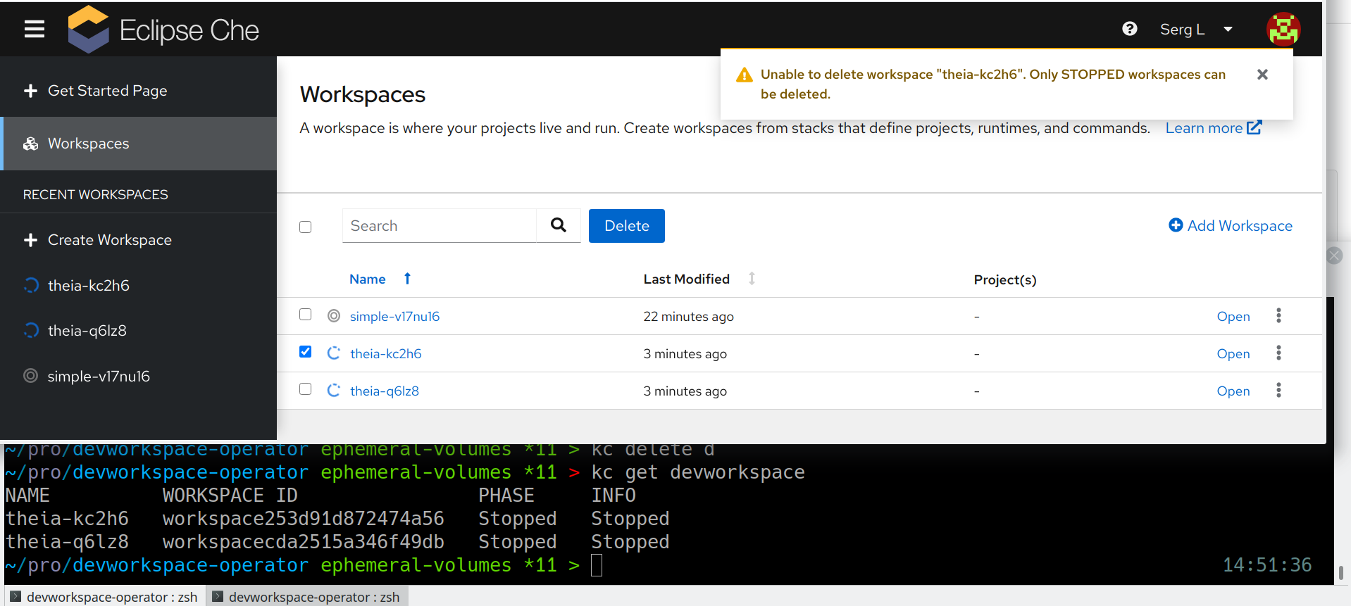 - After DevWorkspace is removed on the cluster, it's still on the Dashboard (which is not really a bug but since we request each second, would be great if we're able to update dashboard state).