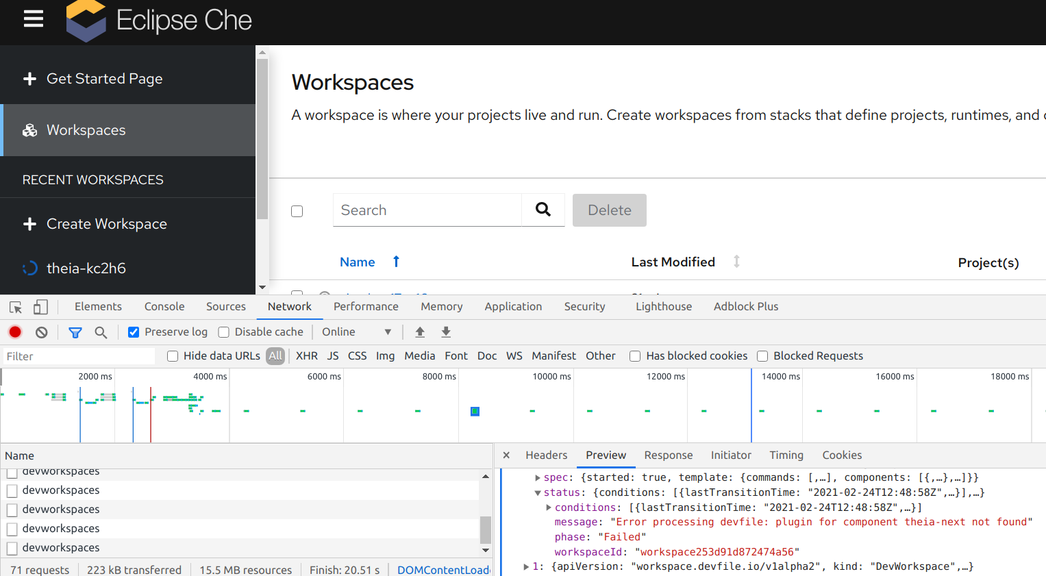 Error: Failed to create a new workspace from the devfile: Cannot read property 'push' of undefined
