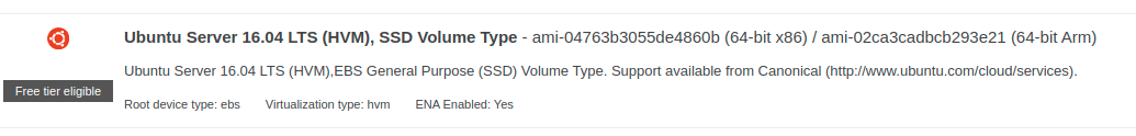Clique em Launch Instance e selecione a imagem Ubuntu Server 16.04 LTS AMI (Eligible for Free tier).