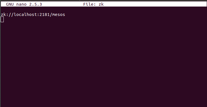 Navegue para o diretório: /etc/mesos e edite o arquivo zk para apontar para o IP interno da instância do zookeeper como mostrado na imagem abaixo, novamente, como estamos utilizando uma única máquina pode-se usar localhost. Caso haja mais de uma instância rodando um mesos-master, o mesmo deverá ser feito em todas.