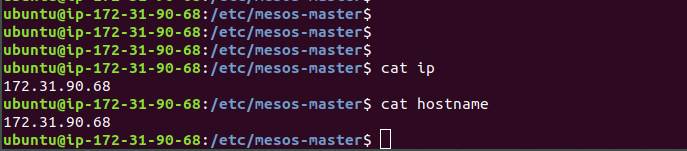 $ cd /etc/mesos-master $ sudo sh -c 'echo "[IP-INTERNO-DA-INSTANCIA]" >> ip' $ sudo sh -c 'echo "[IP-INTERNO-DA-INSTANCIA]" >> hostname' $ cat ip $ cat hostname