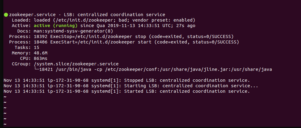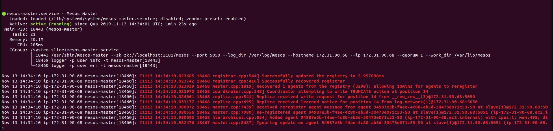 $ sudo service mesos-slave statusO output deve ser parecido com o mostrado abaixo para o zookeeper: