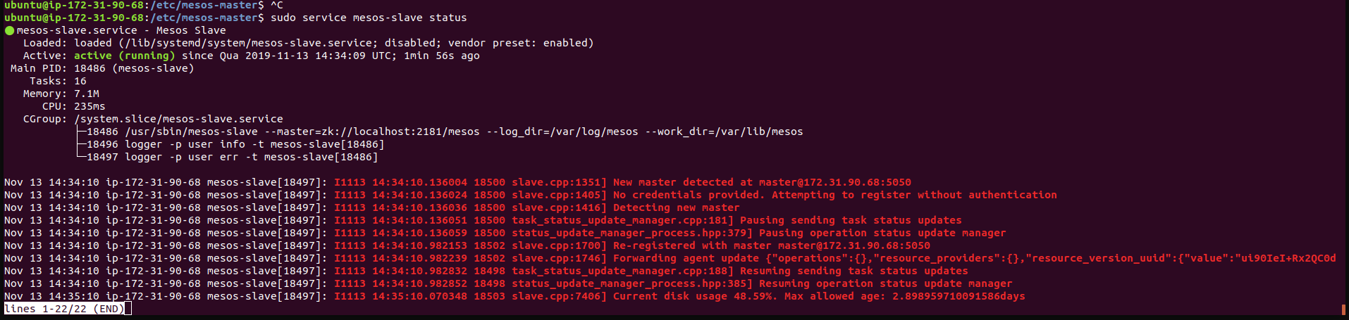 $ sudo service mesos-slave startPara verificar que tudo está rodando sem erros utilize os seguintes comandos para obter o status dos processos: