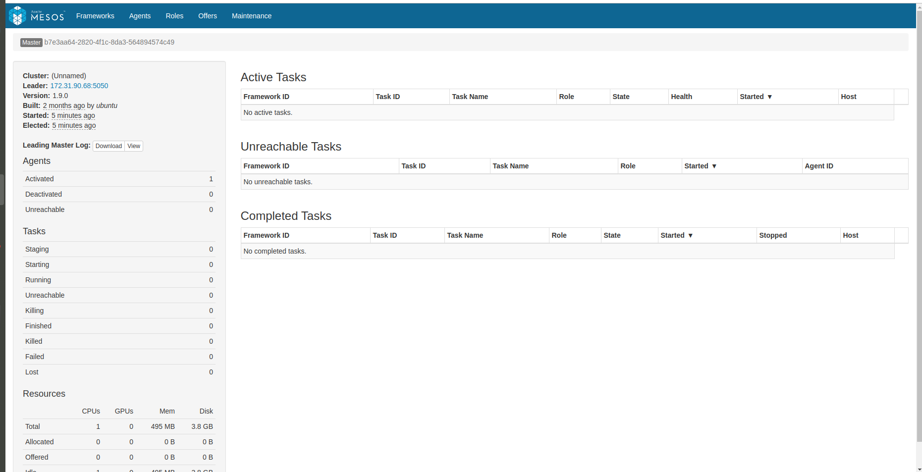 Quando todos os serviços estiverem rodando corretamente, utilize seu browser e acesse o endereço [IP_PUBLICO_INSTANCIA]:5050 para entrar no dashboard do mesos, ilustrado abaixo: Observação: Se seu computador estiver conectado a uma rede pública, como de faculdades, esse endereço pode ser bloqueado no browser.