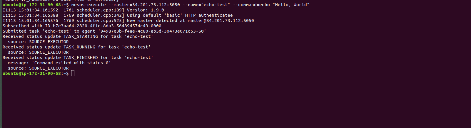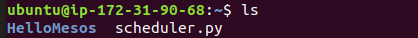 Task("taskDIR", "mkdir /home/ubuntu/HelloMesos", .1, 100)A primeira simplesmente executa um comando "echo HelloWorld", porém não é possível observar o output do comando, uma vez que ele roda no agente. Então, criamos uma segunda tarefa para conseguirmos observar de fato sua execução, nela há um comando para que uma pasta HelloMesos seja criada no diretório /home/ubuntu. É importante notar que na infraestrutura do Mesos que criamos nesse tutorial tanto o master quanto os agentes estão na mesma máquina, por isso conseguimos observar o resultado do comando dessa segunda tarefa.