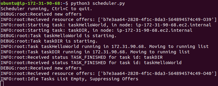 self.idleTaskList.append(Task("taskDIR", "mkdir /home/ubuntu/HelloMesos", .1, 100))Então, temos um método resourceOffers que verifica se há alguma tarefa pendente na lista e caso haja, ele cria uma oferta para essa tarefa por meio do método acceptOffer da classe Task. Assim, caso a oferta seja aceita ele executa a tarefa no cluster e a adiciona na lista correspondente.