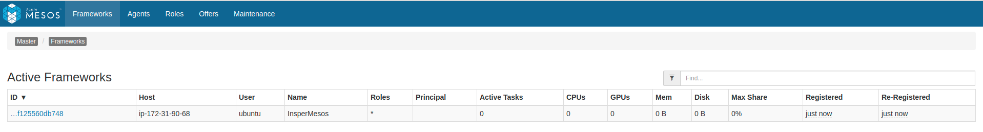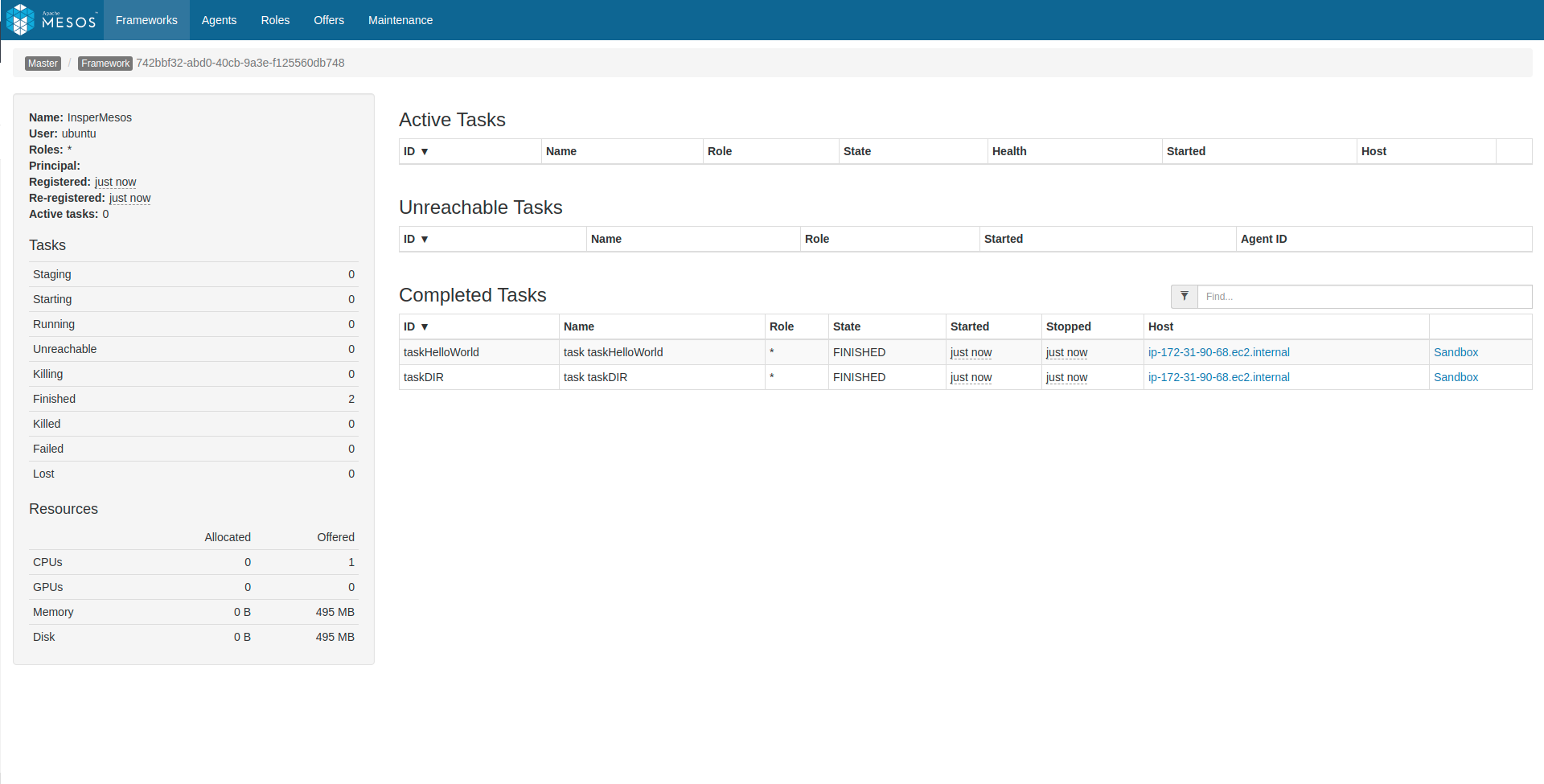 Além disso, é possível ver o framework criado na dashboard do Mesos, com seus detalhes e tarefas executadas.