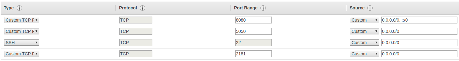 Na seção de Security Groups, crie um com as portas 22, 2181, 5050 abertas. Caso planeje instalar o Marathon posteriormente, abra a porta 8080 também para acessar o Marathon UI.