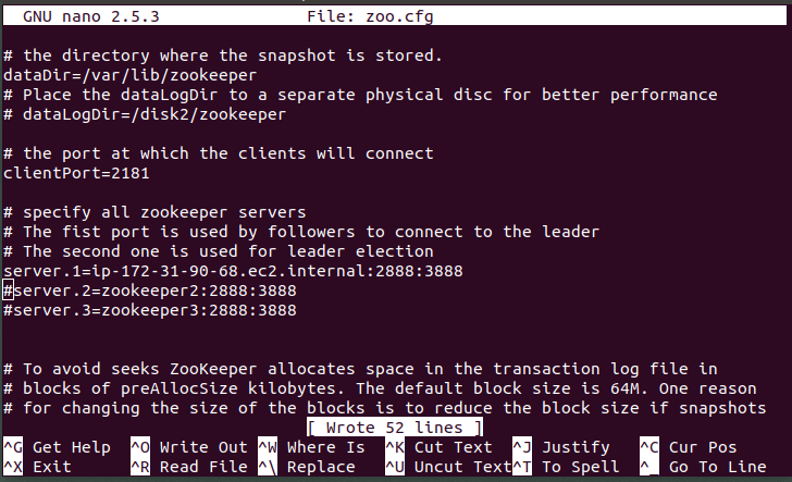 $ cd /etc/zookeeper/conf $ sudo nano zoo.cfg -
