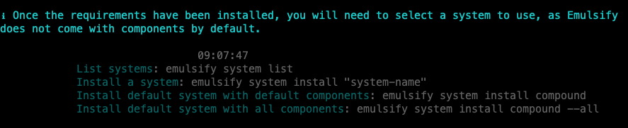 npm buildandnpm linkcomposer create-project drupal/recommended-project drupal-foldernpm link @emulsify/cli(make sure there are no warnings/errors)emulsify init "Theme Name". You'll see a new option listed that allows an individual to install all components instead of just the default (screen shot below)emulsify system install compound --all. To verify, you can go to your theme directory and checkout the components. For example, thecardis not a default component.Closing issues