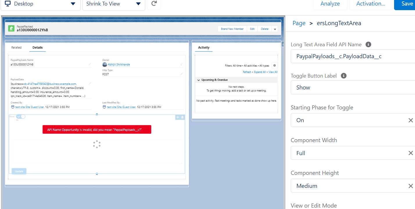 I dragged this component on a custom object record page. Now it is spinning out of control with an error message