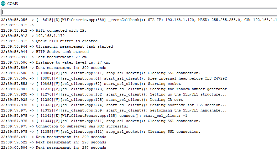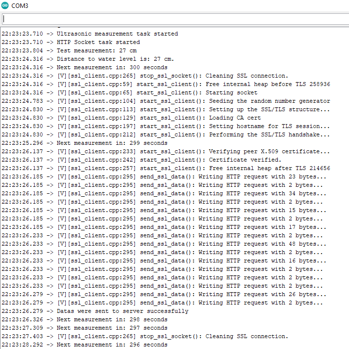 Sketch is using FreeRTOS, there are other versions of sketch without FreeRTOS, but same problem. In FreeRTOS sketch there is used Queue. When datas are measured (once per 5 minutes), they are pushed to Queue, and HTTPS connection task will read them and will execute once to store them in webserver MySQL database.