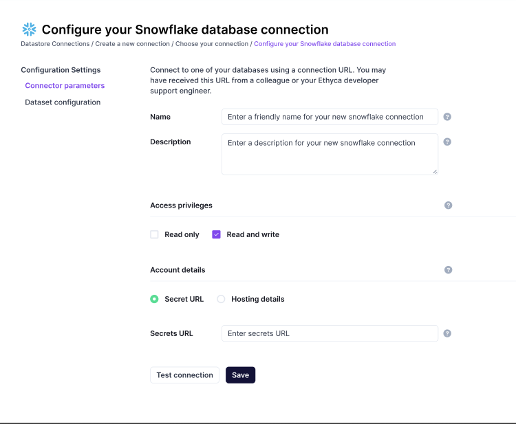Demonstrate that a user can configure the connector params for that database. Fields include: