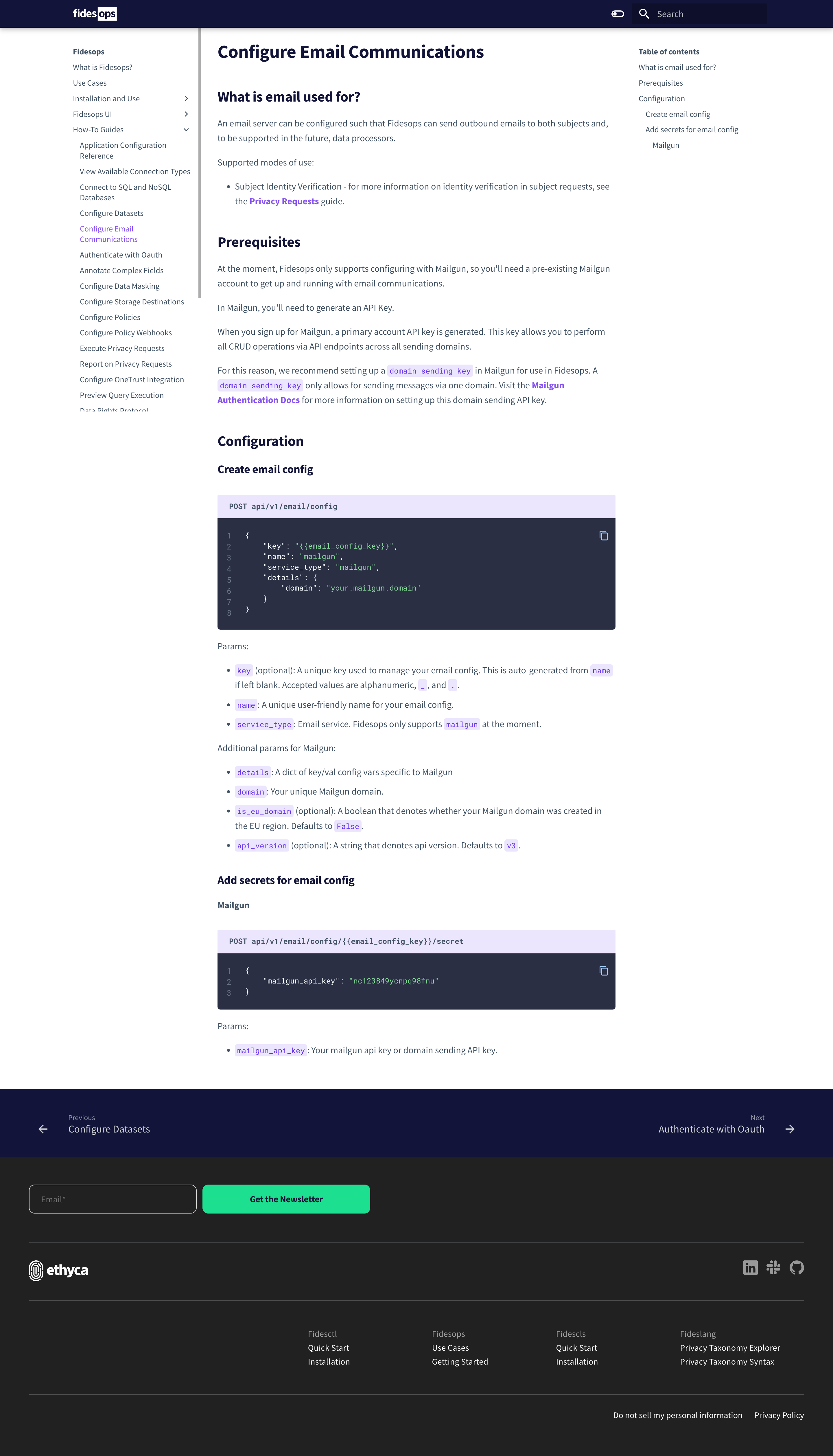Adds guide on email communications and setting up an email config/secrets to docs.