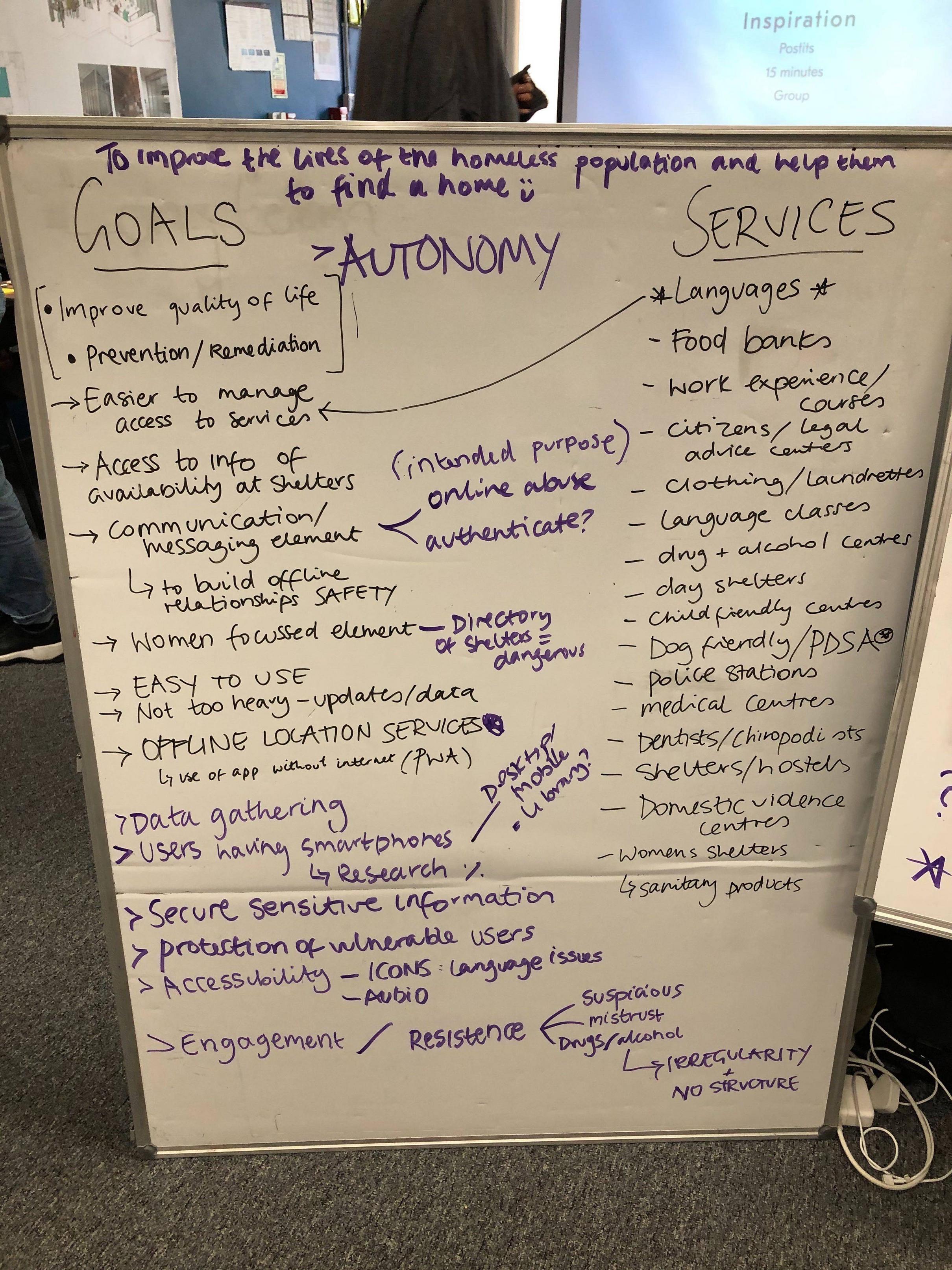 - We recognised that our target user is unlikely to be an 'entrenched rough sleeper' or someone with severe mental health issues. These people clearly need intensive expert support, which an app can't provide. While we want to make our app as inclusive as possible for people in difficulty, we see our target user more as a 'fallen on hard times' type who has some capacity to recognise and seek help for their problems, and will respond more easily to given support.