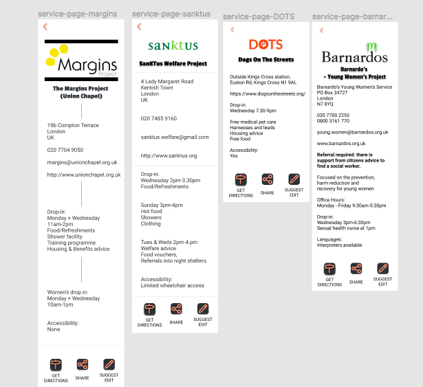 Signpost is an app/desktop website that lets people experiencing or at risk of homelessness find services relevant for them. Services are organised into categories and displayed as pins on a map. Further information such as opening hours and contact details are available for each service. Users can contribute their own suggestions and services to make sure the data is relevant and maintainable.