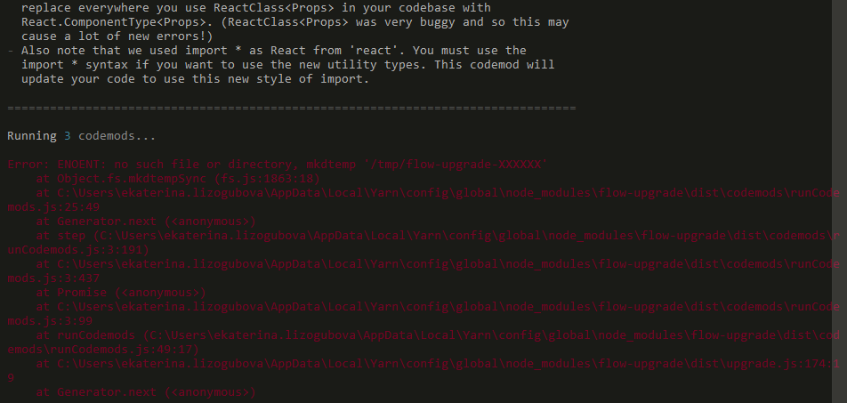 I've tried to run flow-upgrade under Windows 10 and it fails  Then I tried to do it with Windows Ubuntu Bash and everything works. So it seems like it's only Windows specific problem.
